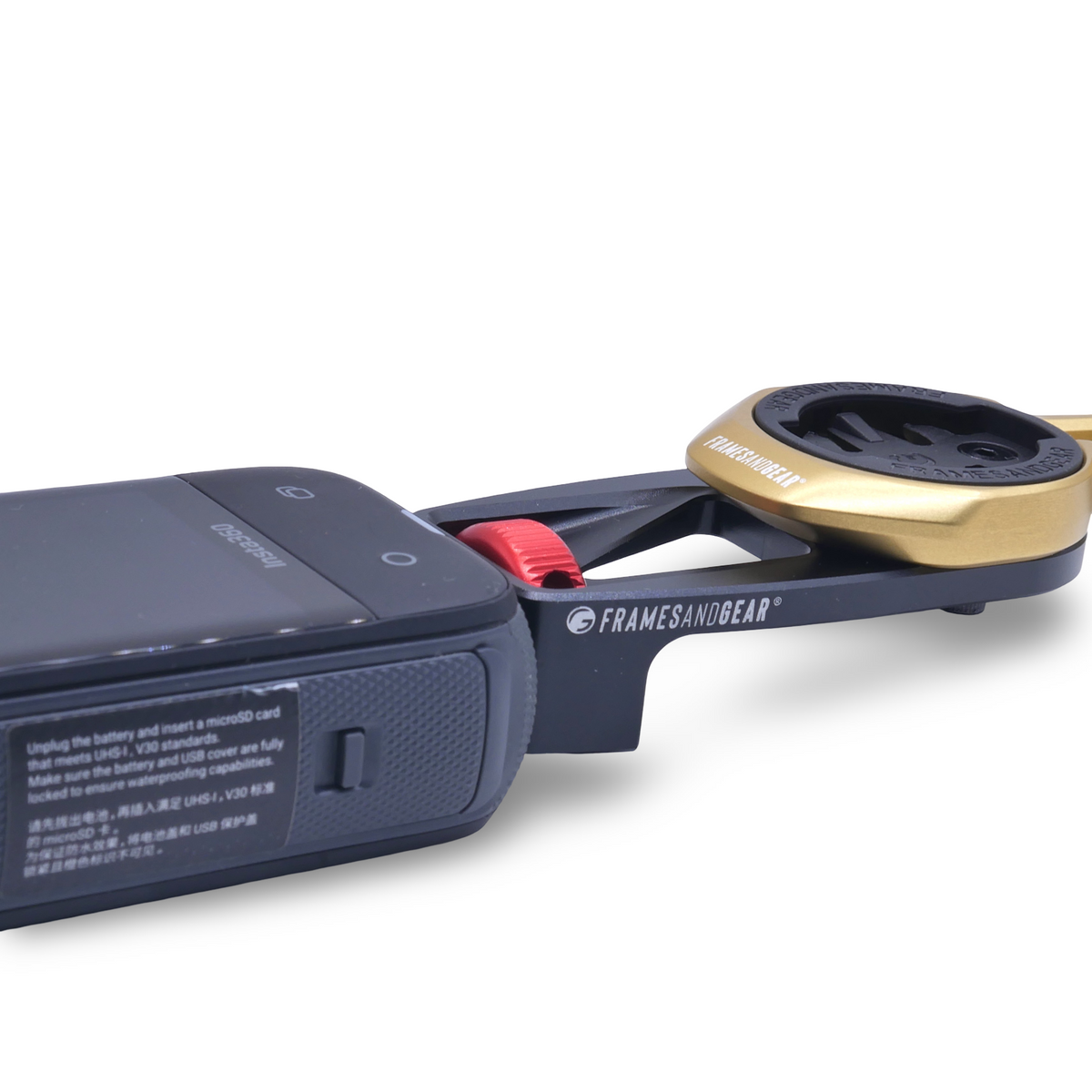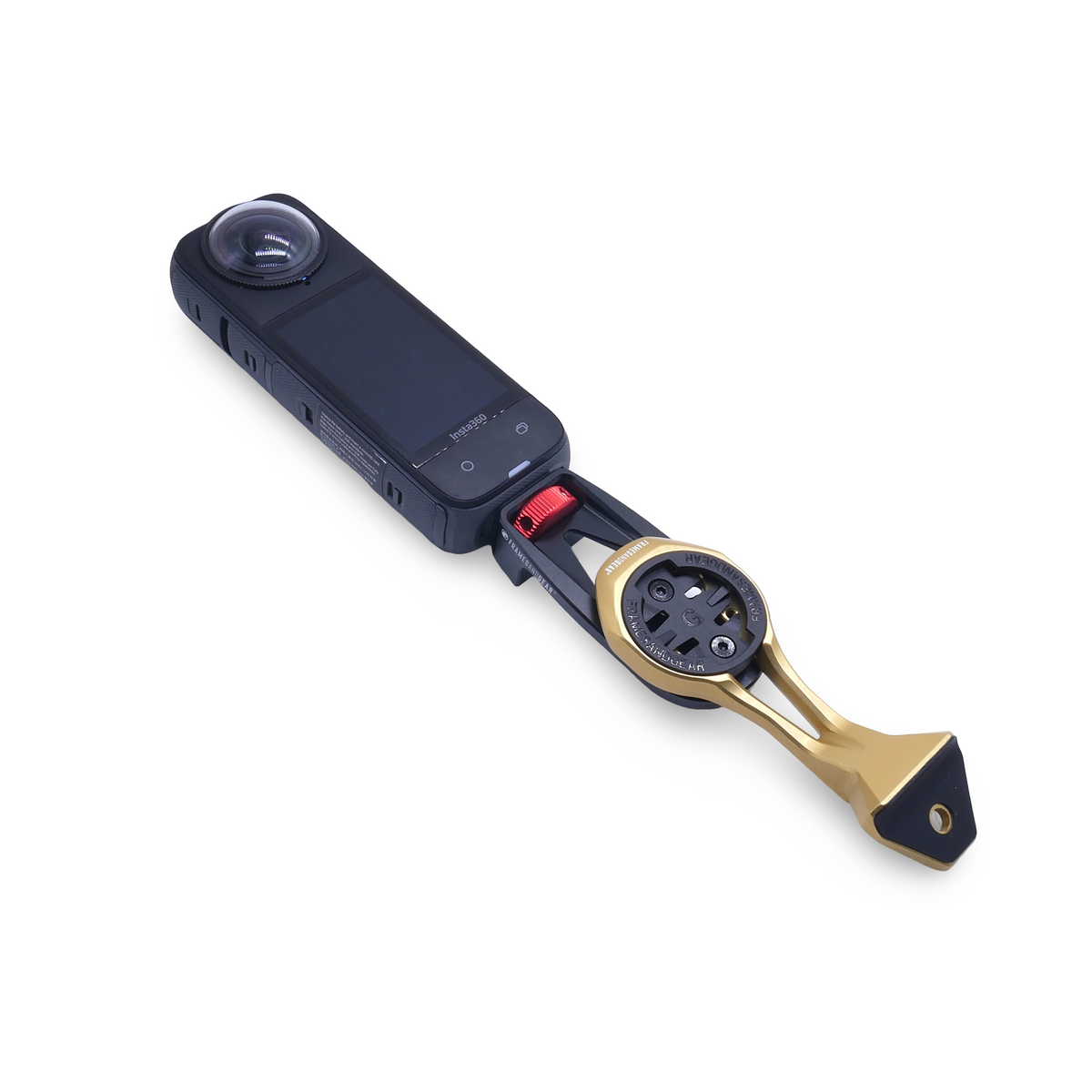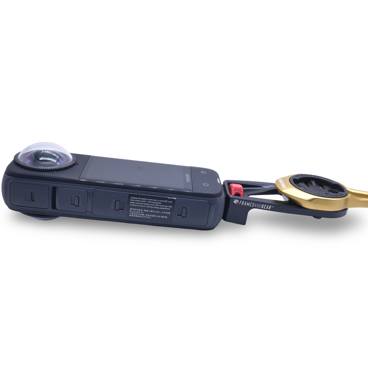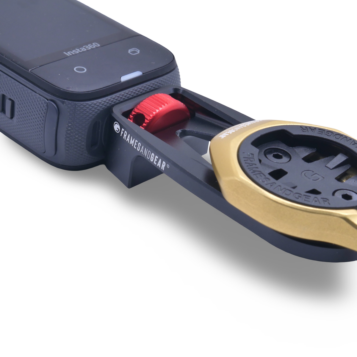 Designed for compatibility with Framesandgear Garmin and Wahoo mounts, this lightweight, durable mount allows easy attachment of the Insta360 setup. The mount fits directly to all Framesandgear computer mounts, just below the computer fitting.